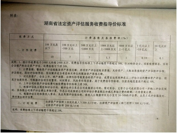 第六條法定資產(chǎn)評估服務(wù)收費實行政府指導(dǎo)價管理,由省物價局會同省財政廳以資產(chǎn)評估服務(wù)的社會平均成本、法定稅費、合理利潤為基礎(chǔ),依據(jù)經(jīng)濟發(fā)展水平、社會承受能力、對資本市場和社會公眾的影響等因素確定。具體指導(dǎo)價標準(見附表)實行基準價和浮動幅度相結(jié)合,資產(chǎn)評估機構(gòu)和委托方應(yīng)根據(jù)當?shù)亟?jīng)濟發(fā)展水平、資產(chǎn)評估業(yè)務(wù)具體情況和管理水平在規(guī)定的浮動幅度內(nèi)確定收費標準。