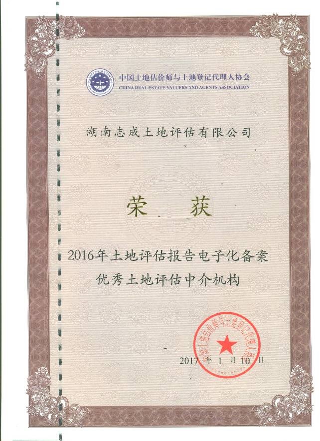 2017年1月獲得中國(guó)土地估價(jià)師與土地登記代理人協(xié)會(huì)土地估價(jià)報(bào)告電子化備案優(yōu)秀土地評(píng)估中介機(jī)構(gòu)。